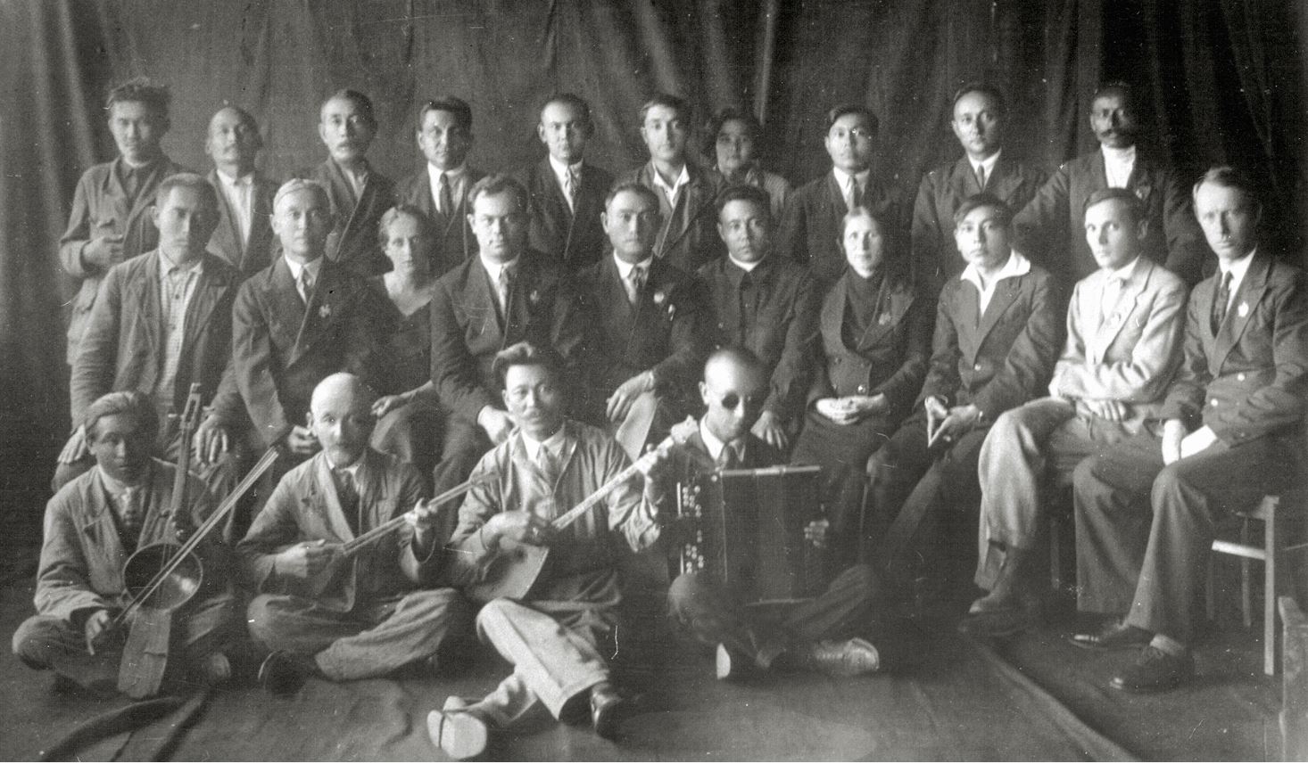 Қазақ радиосы музыкалық хабарларының қызметкерлері. Екінші қатарда сол жақтан төртінші – композитор Борис Ерзакович, 1931-1938